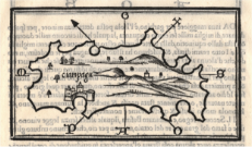 ヴェネツィアで活躍した地図製作者ボルドーネ著作の地図帳に収められた日本図。マルコ・ポーロが伝え、15世紀末以来の地球儀にも描かれた縦長の日本(Ciampagu チャンパグ)地図の形態を踏襲している。西欧出版物の中で、日本を単独の島国として初めて描いた地図。