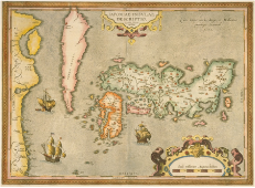 ポルトガル人地図製作者ルイス・テイシェイラが作成(?)した日本図をオランダ人オルテリウスが入手し、ヨーロッパで最初の近代的地図帳「世界の舞台」に収めた日本地図の決定版。ヨーロッパの市販地図に描かれた単独の日本地図としては最古のもの。出版当時のヨーロッパ人による日本・極東アジア周辺の地形認識が窺える他、ヨーロッパ人の関心に基づいた「Argenti fodina(銀山)」(石見銀山)などの情報も特記されている。