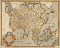 「メルカトル図法」で知られるフランドル人地図製作者メルカトルの遺作「世界地図帳」第1巻(1585年初版)所収のアジア地図。おたまじゃくし型の日本(Iapan)には、ザビエルの書簡などの情報に依拠したと思われるミヤコ(Miaco)や坂東(Bandu)、山口(Amaguco)、鹿児島(Cangoxima)などの各地の地名が記されている。オルテリウスの日本図と同様、西欧世界で広く流布した。